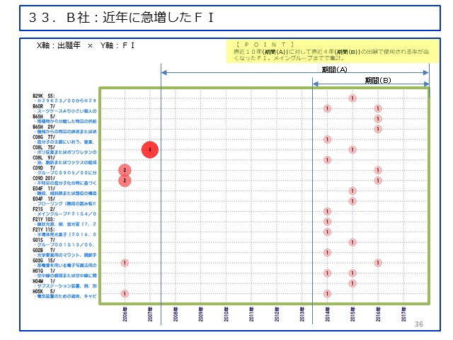 | 【B社:近年に急増したFI】 直近10年(期間(A))に対して直近4年(期間(B))の出願で 使用される率が高くなったFI。メイングループまでで集計。 |