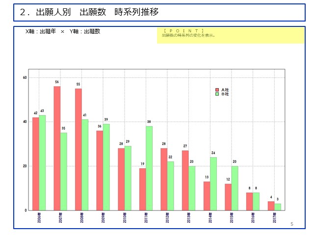 【分析の対象】 自社の競合企業の特許出願の特徴を、2社を比較することによって傾向付ける。 |