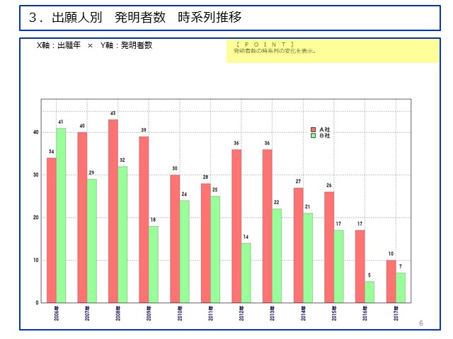 | 【出願人別 発明者数 時系列推移】 2006年を除いて、公報に記載された発明者数はA社のほうが多く、 A社のほうが開発に対する人件費をかけているのではないかと推測することができる。 B社は出願数の減少と発明者数の減少が同じような推移を見せているところから、 人件費・開発費の縮小がそのまま出願数の減少に直結したと考えてよいのではないだろうか。 |